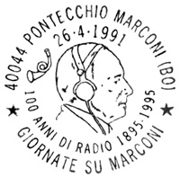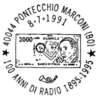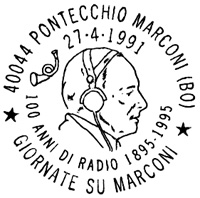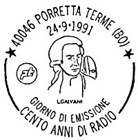 **** Annullo Primo giorno della prima delle emissioni " Cento Anni di Radio ". Un accordo intervenuto fra le Poste Italiane e quelle Sammarinesi stabilisce che tra il 1991 e il 1994 sia emesso ogni anno congiuntamente un francobollo dedicato ad uno Scienziato che con le sue ricerche e le sue invenzioni è stato precursore dell'invenzione della radio. |