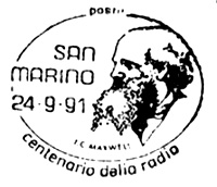 **** Annullo Primo giorno della prima delle emissioni " Cento Anni di Radio ". Un accordo intervenuto fra le Poste Italiane e quelle Sammarinesi stabilisce che tra il 1991 e il 1994 sia emesso ogni anno congiuntamente un francobollo dedicato ad uno Scienziato che con le sue ricerche e le sue invenzioni è stato precursore dell'invenzione della radio. |