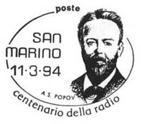**** Annullo Primo giorno della prima delle emissioni " Cento Anni di Radio ". Un accordo intervenuto fra le Poste Italiane e quelle Sammarinesi stabilisce che tra il 1991 e il 1994 sia emesso ogni anno congiuntamente un francobollo dedicato ad uno Scienziato che con le sue ricerche e le sue invenzioni è stato precursore dell'invenzione della radio. |